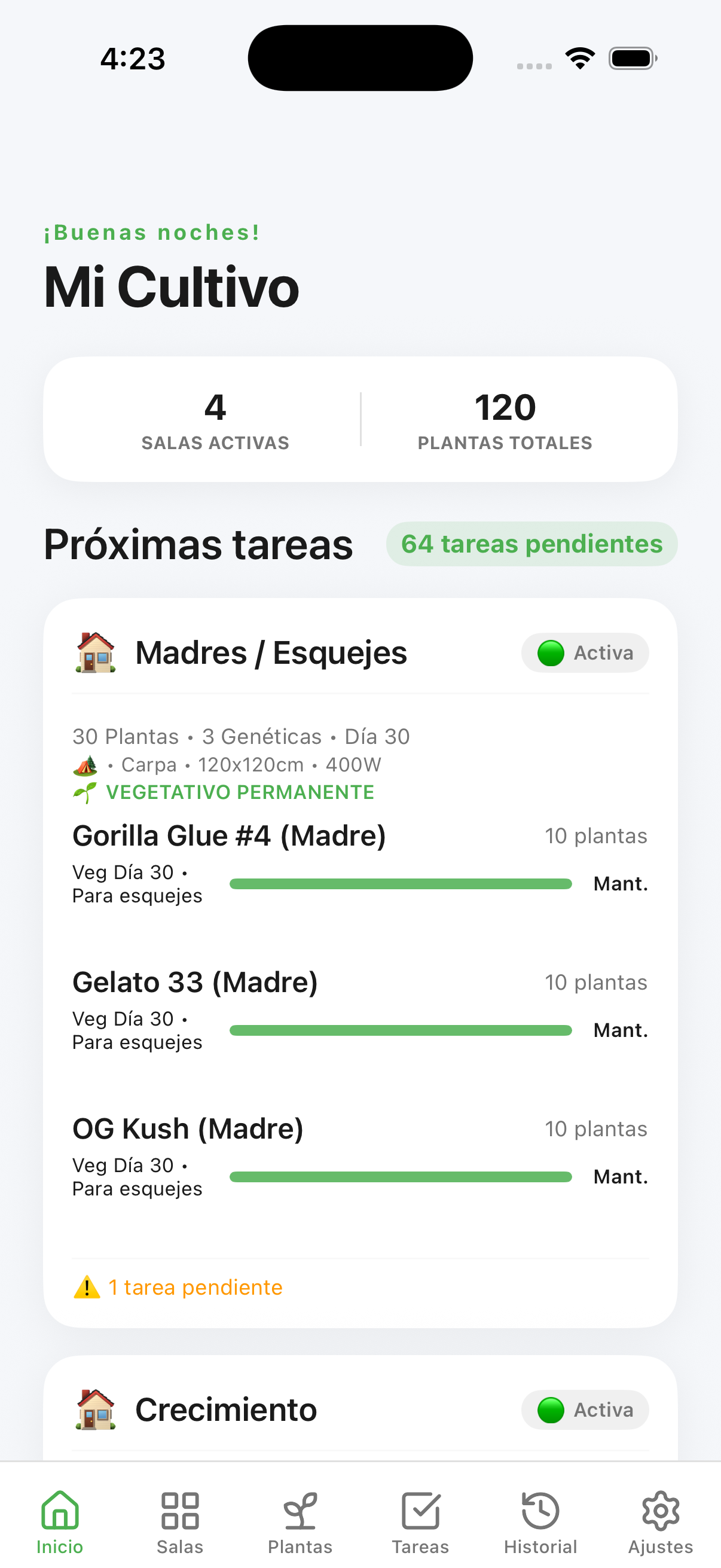 - Badge de Fase: Indica visualmente si estás en VEGETATIVO, FLORACIÓN o AUTOMÁTICA.