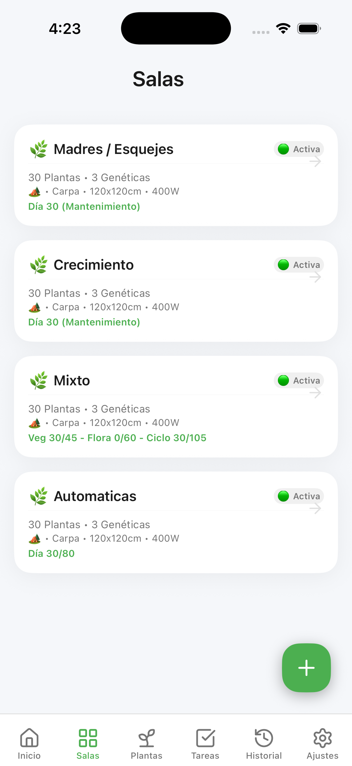 - Configuración Biológica: Diferenciación entre Semillas o Esquejes, y el tipo de ciclo (Foto/Auto).