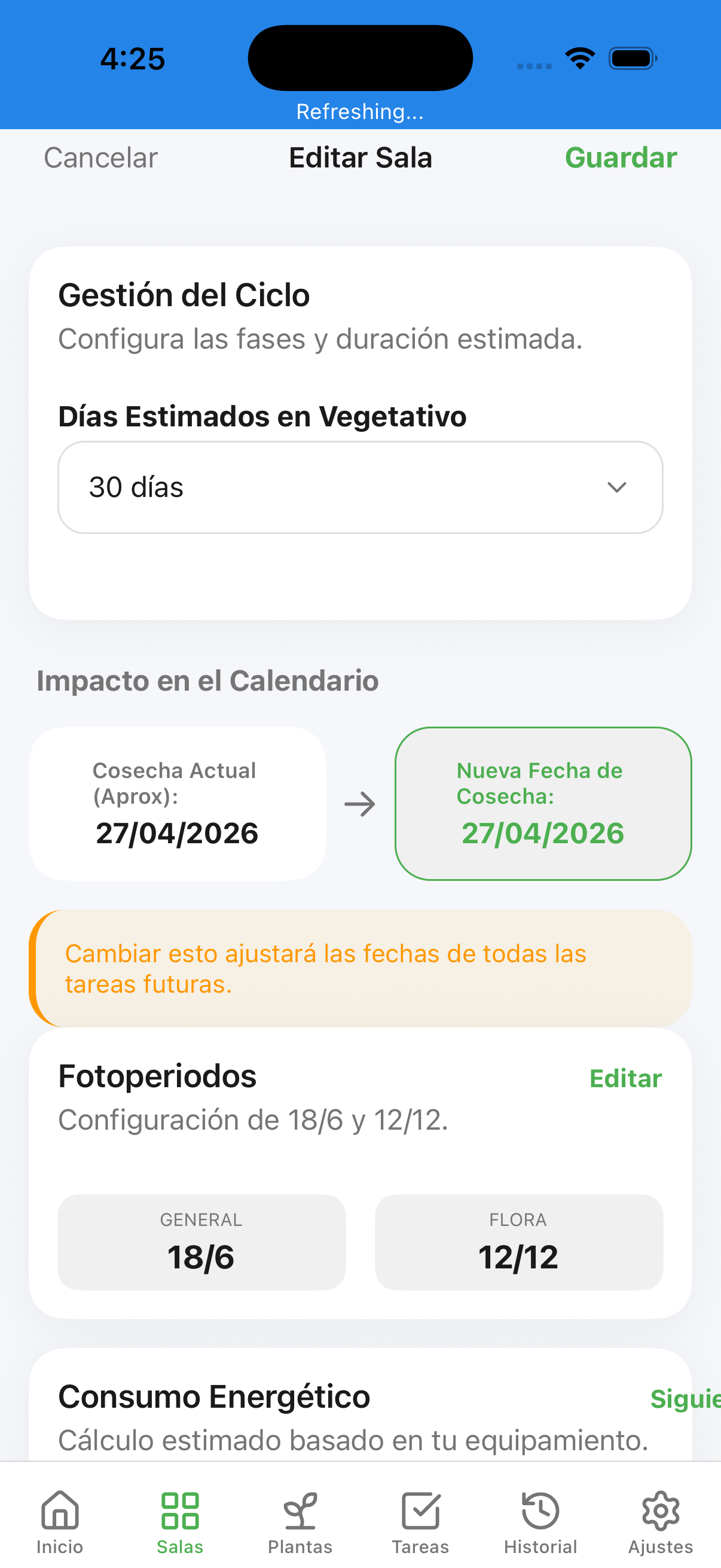 Al editar un ciclo, puedes configurar las horas de Luz/Oscuridad. Bitacorapp cruza estos datos con tu inventario de equipos para calcular el **Consumo Eléctrico Diario estimado (kWh)**.