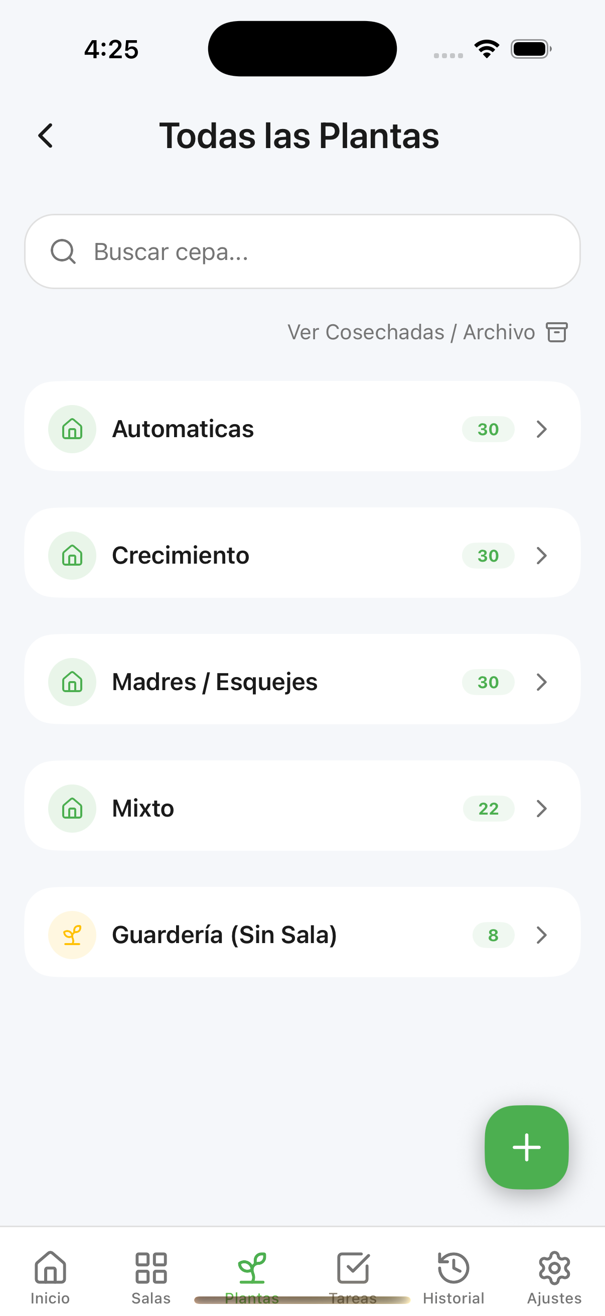 Nota: Una vez que agregues plantas, el modo de cultivo se bloquea para mantener la integridad de los datos.