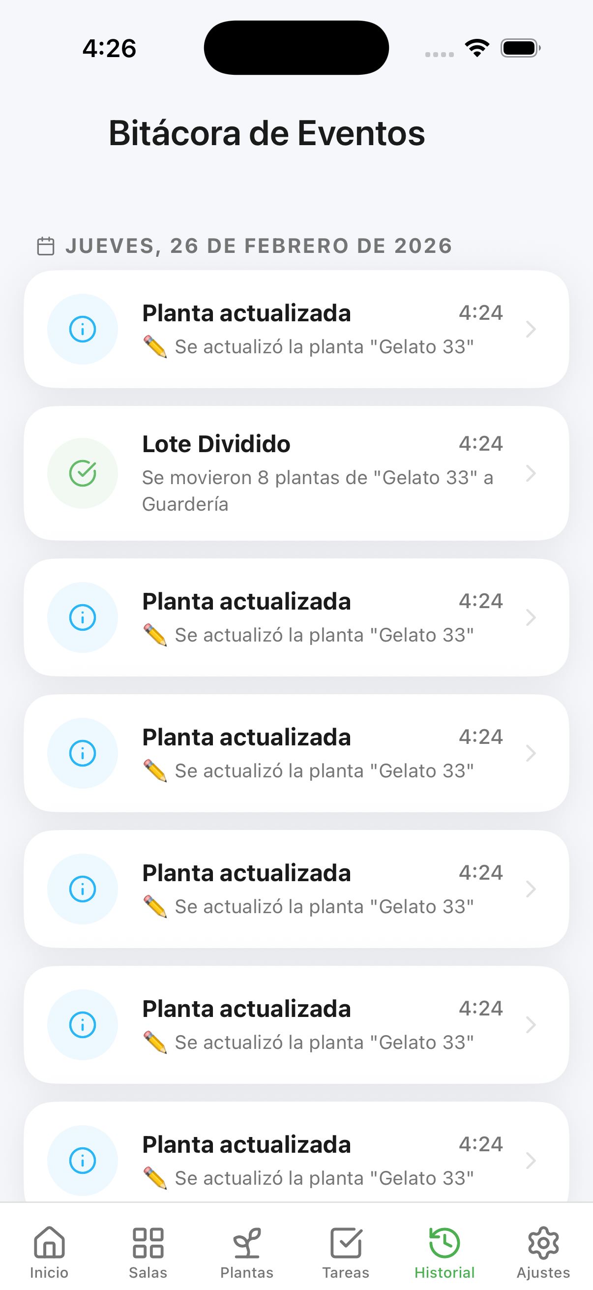 En la pestaña de Historial, accedes a la cronología técnica de tu cultivo. Cada "Log" guarda parámetros críticos: